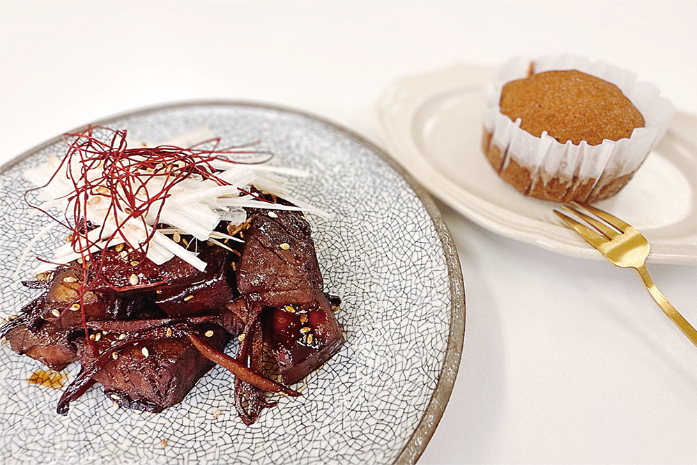 ④マグロに火が通ったら、火を止めてゴマを絡める。お好みのお皿に盛り、白髪ねぎと糸唐辛子をトッピングする。