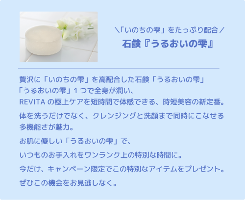 「いのちの雫」をもう1本、いのちの雫が配合された石鹸「うるおいの雫(100g)」を1個プレゼント